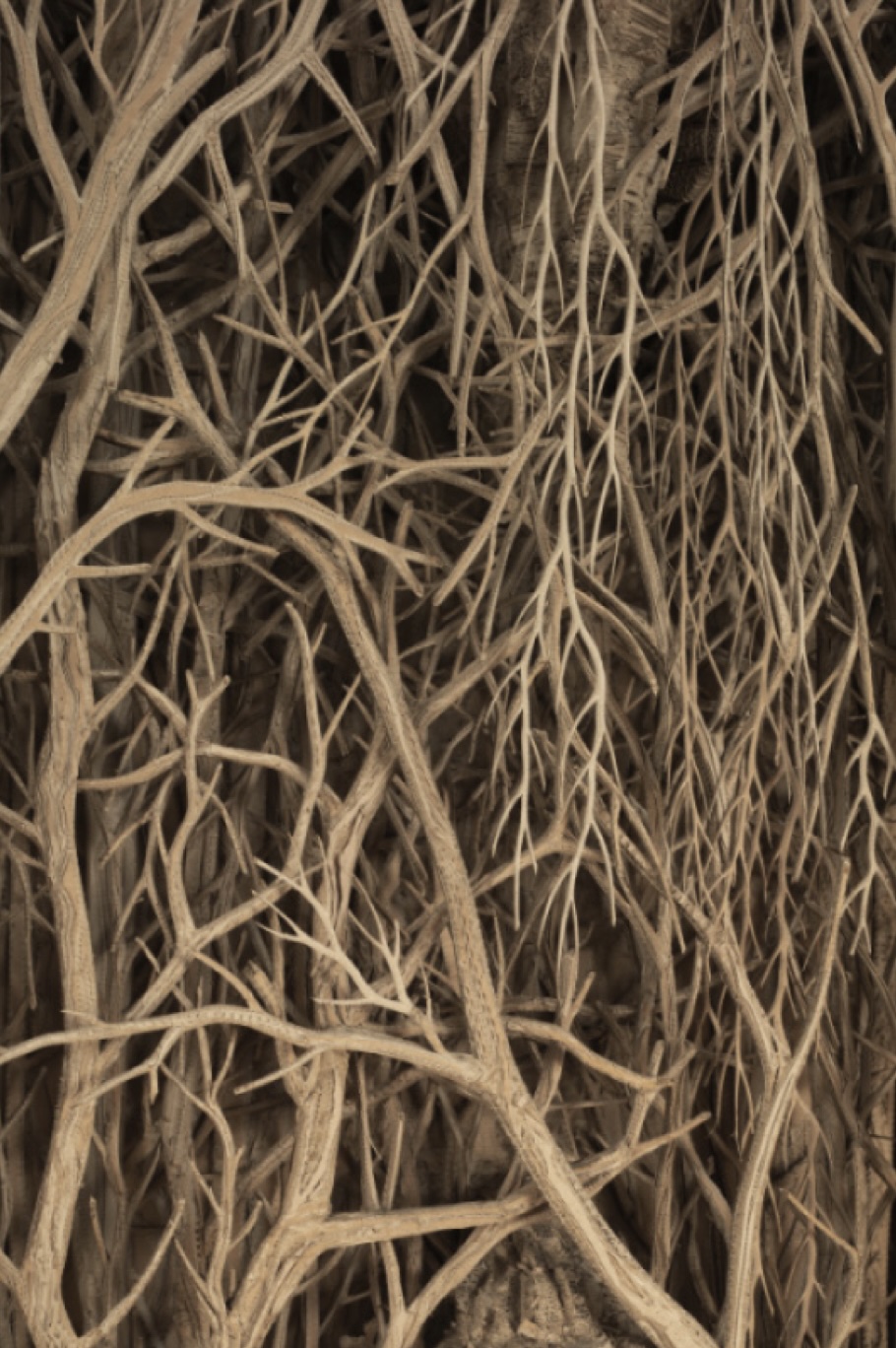 De là naquit le terme « grotesque », ce style où végétal, architecture et féerie s’entrelacent, défiant catégories et logiques. Ici, la grotte devient seuil, matrice et métaphore. Elle rejoint les forêts d’Eva Jospin, leurs entrelacs de matières, leurs densités mystérieuses. Ses dessins, sculptures et installations apparaissent comme des fragments de mondes oubliés, paysages intérieurs que l’on dévoile couche après couche. La visite se vit comme une traversée. On avance d’un promontoire vers un cénotaphe, contournant des ruines, entrant dans un dôme évoquant le Panthéon.