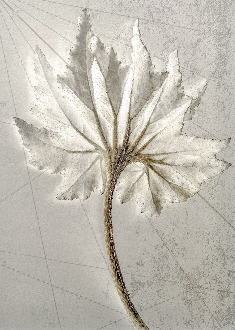Dans la seconde salle de la galerie, Sophie dévoile des photos de plantes aux tons diaphanes, graphiques, traversées de part en part de lignes, de flèches et de points énigmatiques. Évocations des lointaines expéditions navales liées à l’histoire militaire de la ville de Rochefort, à partir de la fin du 18e siècle. Sur ses clichés, les interventions au fil d’or ou d’argent, réalisées par la brodeuse Sylvie Deschamps, créent des œuvres très originales. Un véritable voyage entre la temporalité et l’espace. galeriexii.com