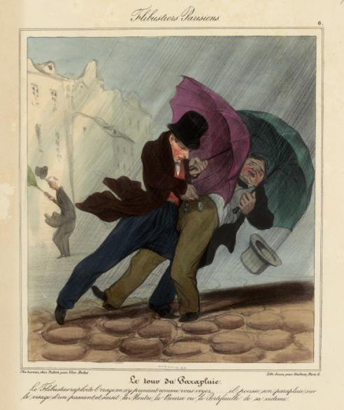 Certains s’attachent au portrait d’une société urbaine, arpentant sous la pluie les rues et les grands boulevards. Comme William Turner, Gustave Doré, Gustave Caillebotte, James Tissot, Camille Pissarro, Gustave Courbet ou Brassaï. L’enjeu est moins de la représenter que de suggérer son effervescence moderne autour du parapluie, objet iconique d’une nouvelle culture populaire. Au tournant du 20e siècle et jusque dans les années 1930, ils en proposent, avec les photographes, une autre vision. Entre métamorphose et enchantement, au-delà du sentiment d’une grisaille mélancolique.